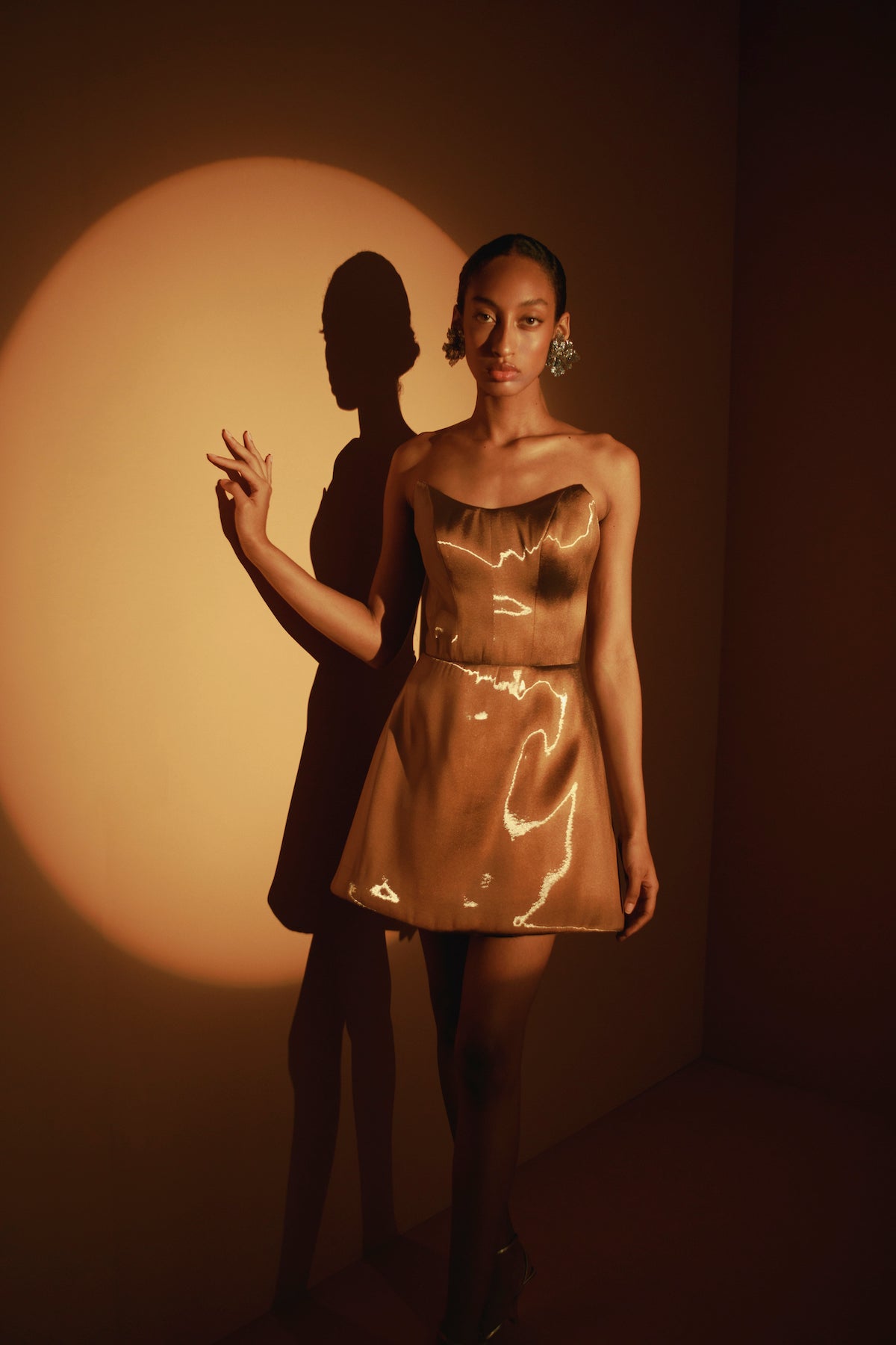 Sleek and striking, the Liquid Glacier Mini Dress captivates with its glossy, fluid finish and sculpted silhouette, radiating modern elegance.