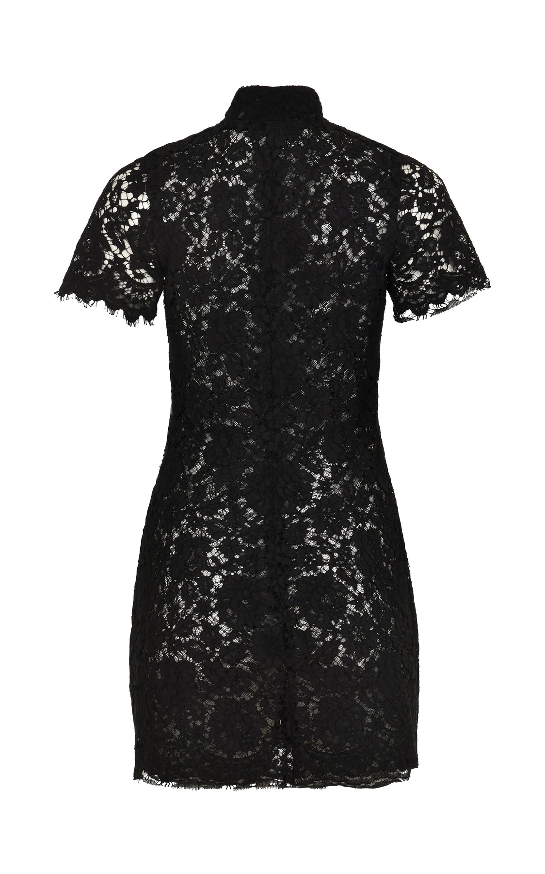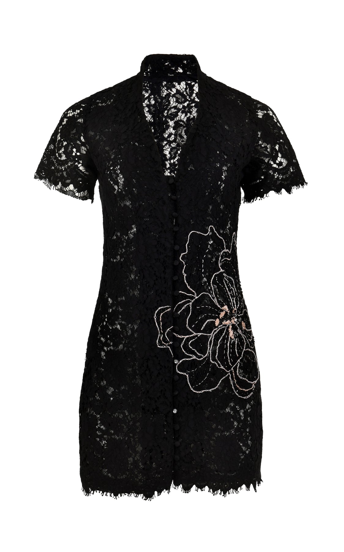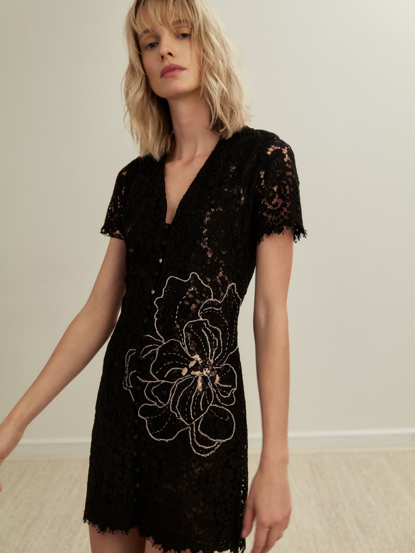 Our Moonlace Mini Dress is a fitted lace silhouette with a deep V neckline and delicate tonal embellishments that add subtle texture and depth.