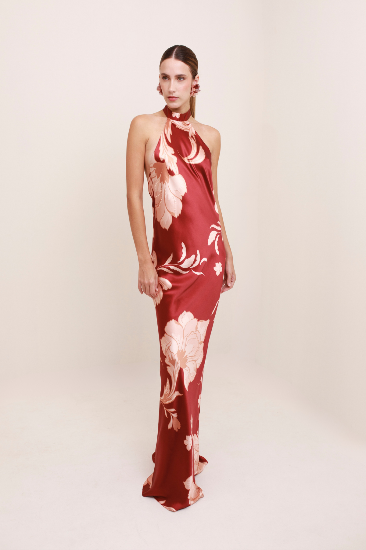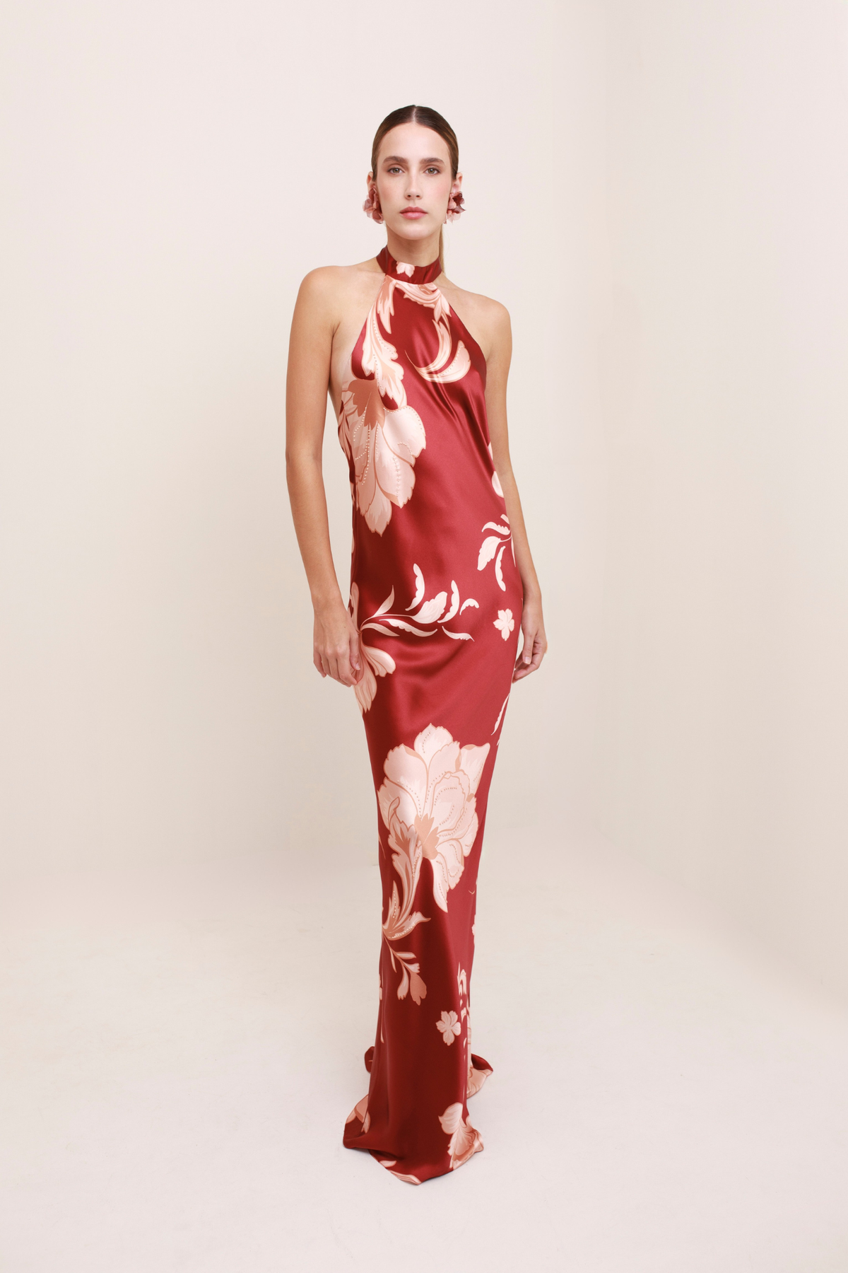 Crafted in printed silk, the Mikaela Dress features soft blush florals over a deep red base — fluid, elegant, and effortlessly striking.