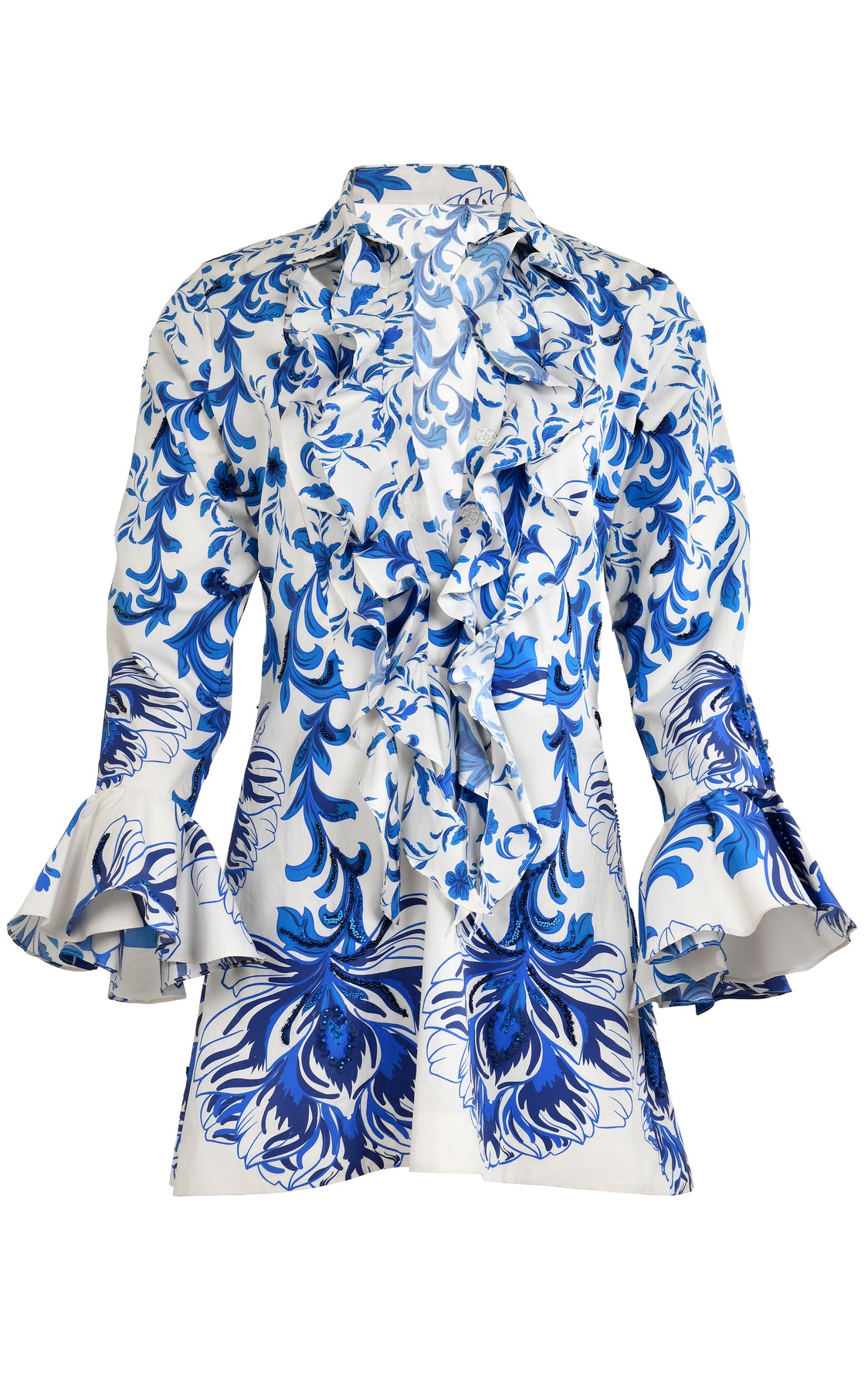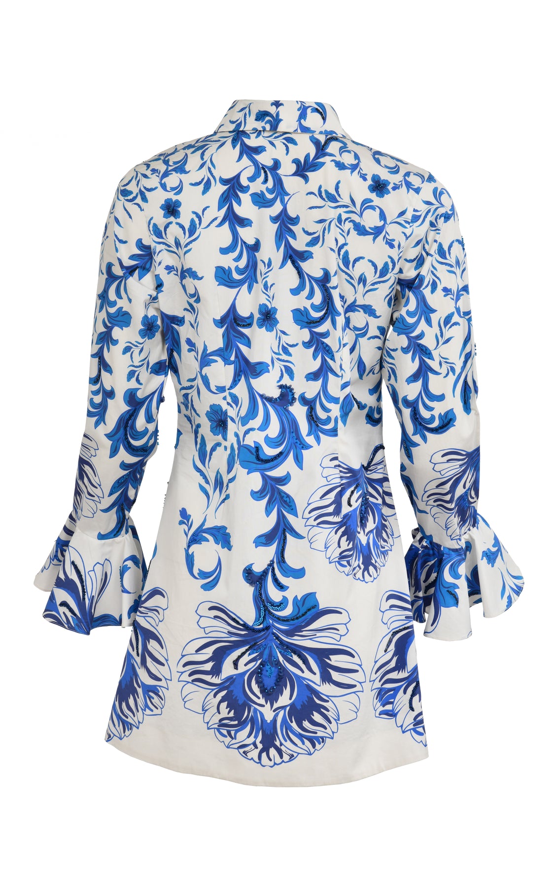 A vibrant mini dress crafted in printed cotton. Featuring a flared silhouette, ruffled cuffs, and a sharp collar, the Cate Dress brings a fresh, playful energy to your wardrobe.
