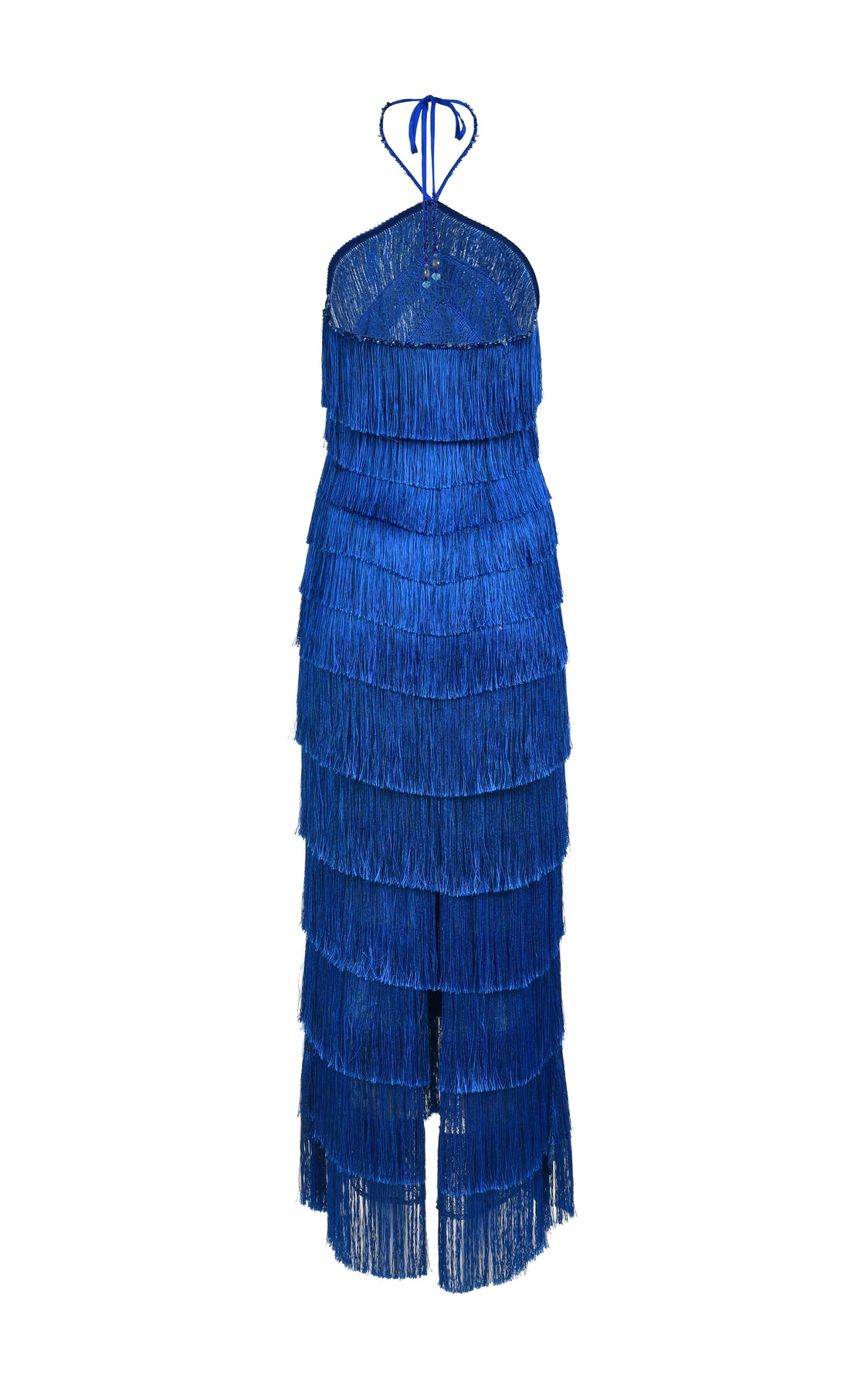 Crafted from pleated fringe, the Estrella Blue Dress brings movement to every step with layered textures and an asymmetrical halter neckline. A striking piece that turns heads with its fluid silhouette and bold color.