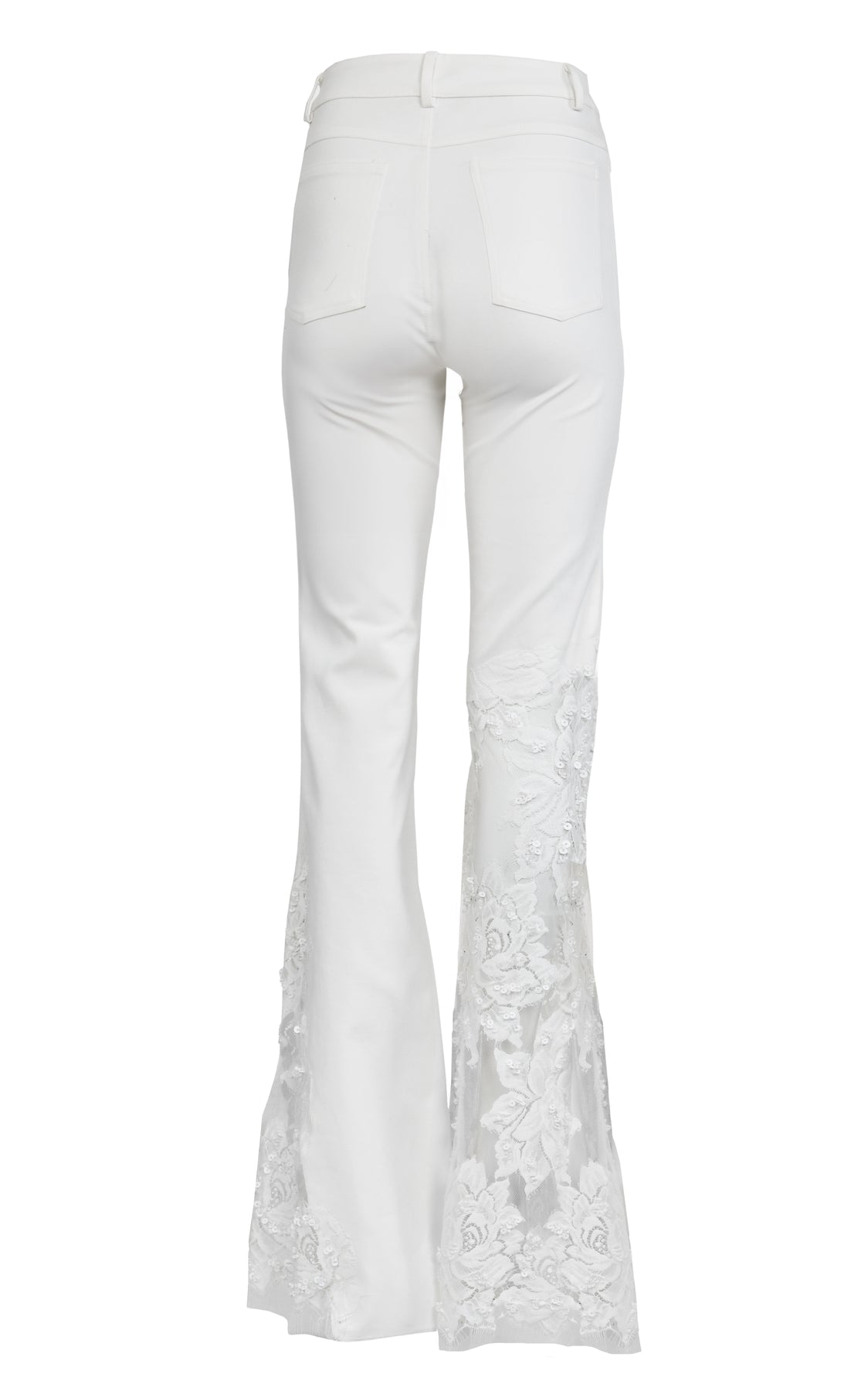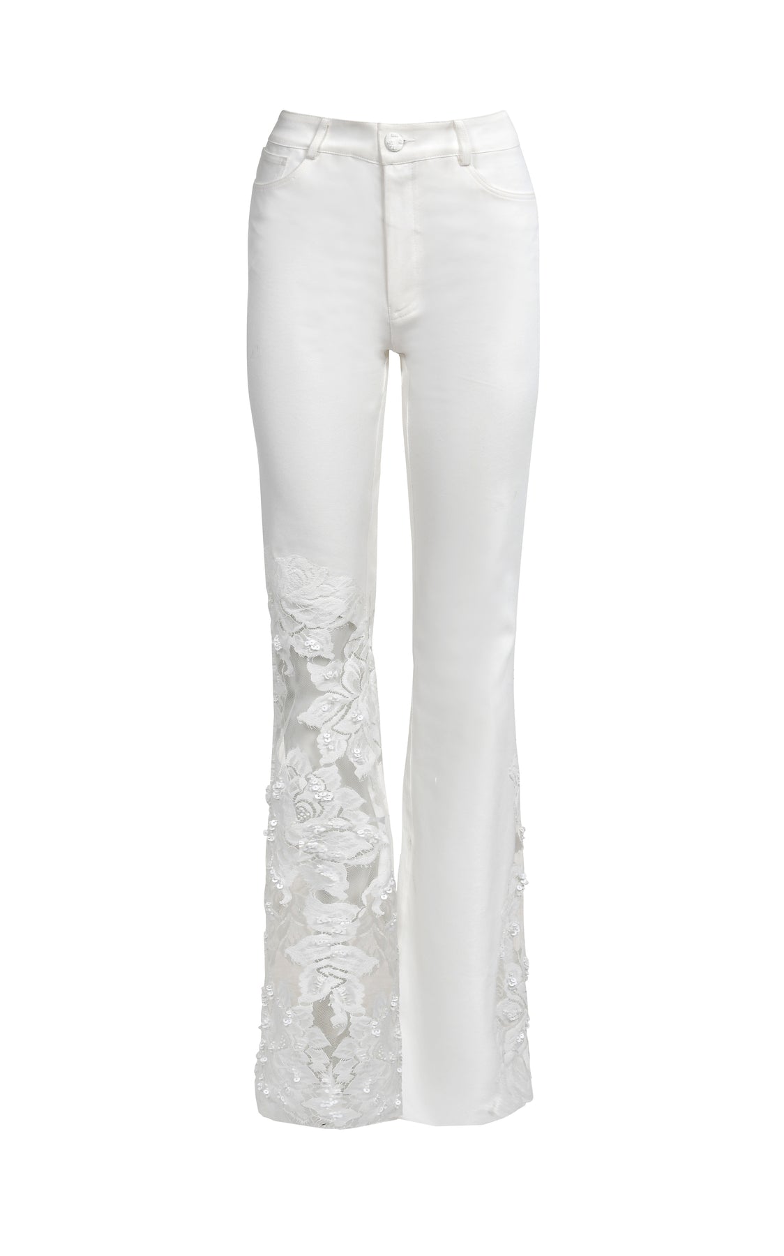 Our Gardenia where white cotton meets floral lace appliqués for a fresh, feminine take on denim. A statement piece that blends structure and delicacy with ease.
