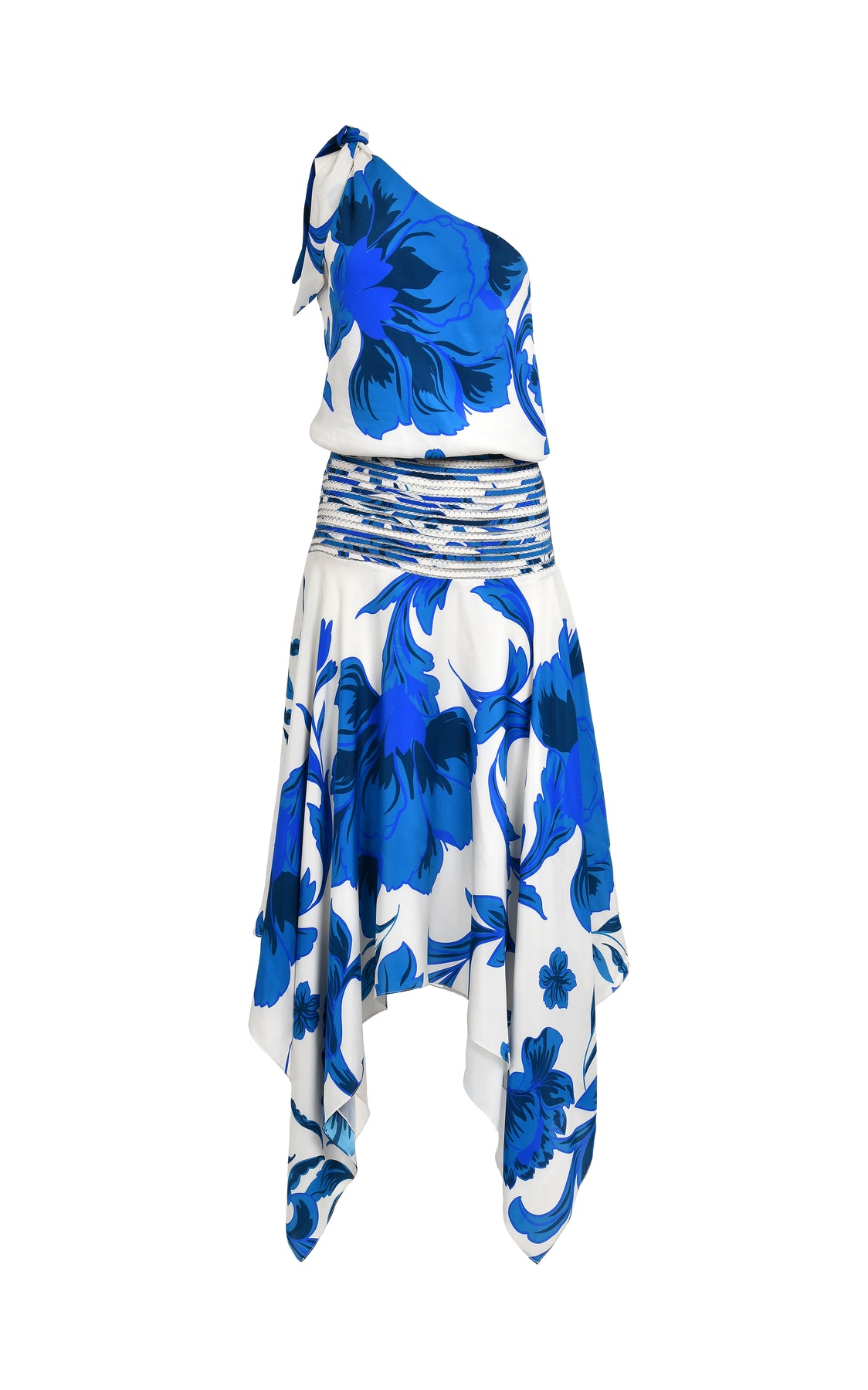 The Halia Dress blends effortless movement with bold design, featuring an asymmetrical one-shoulder neckline and a flowing, asymmetric hem. The woven waist detail, crafted using the intricate pata de cabra technique, adds texture and structure to this fluid silhouette.