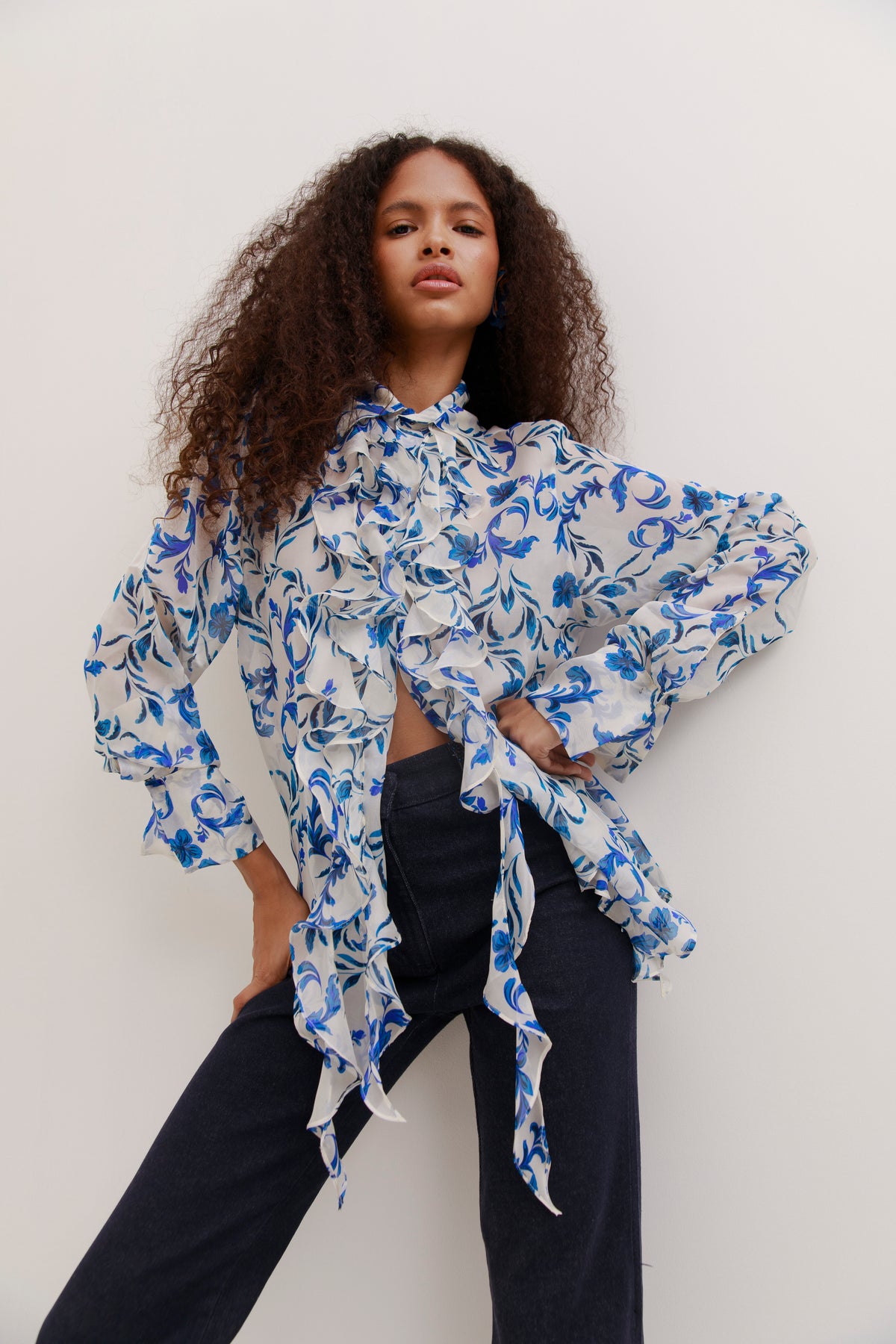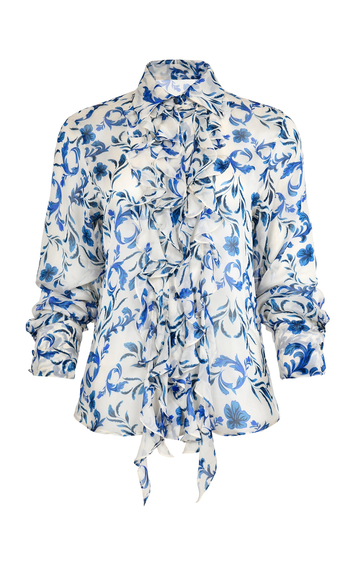Light as air and boldly feminine, the Medusa Blouse flows with cascading ruffles and a vibrant blue floral print. Its sheer fabric and fluid silhouette make it a standout piece.