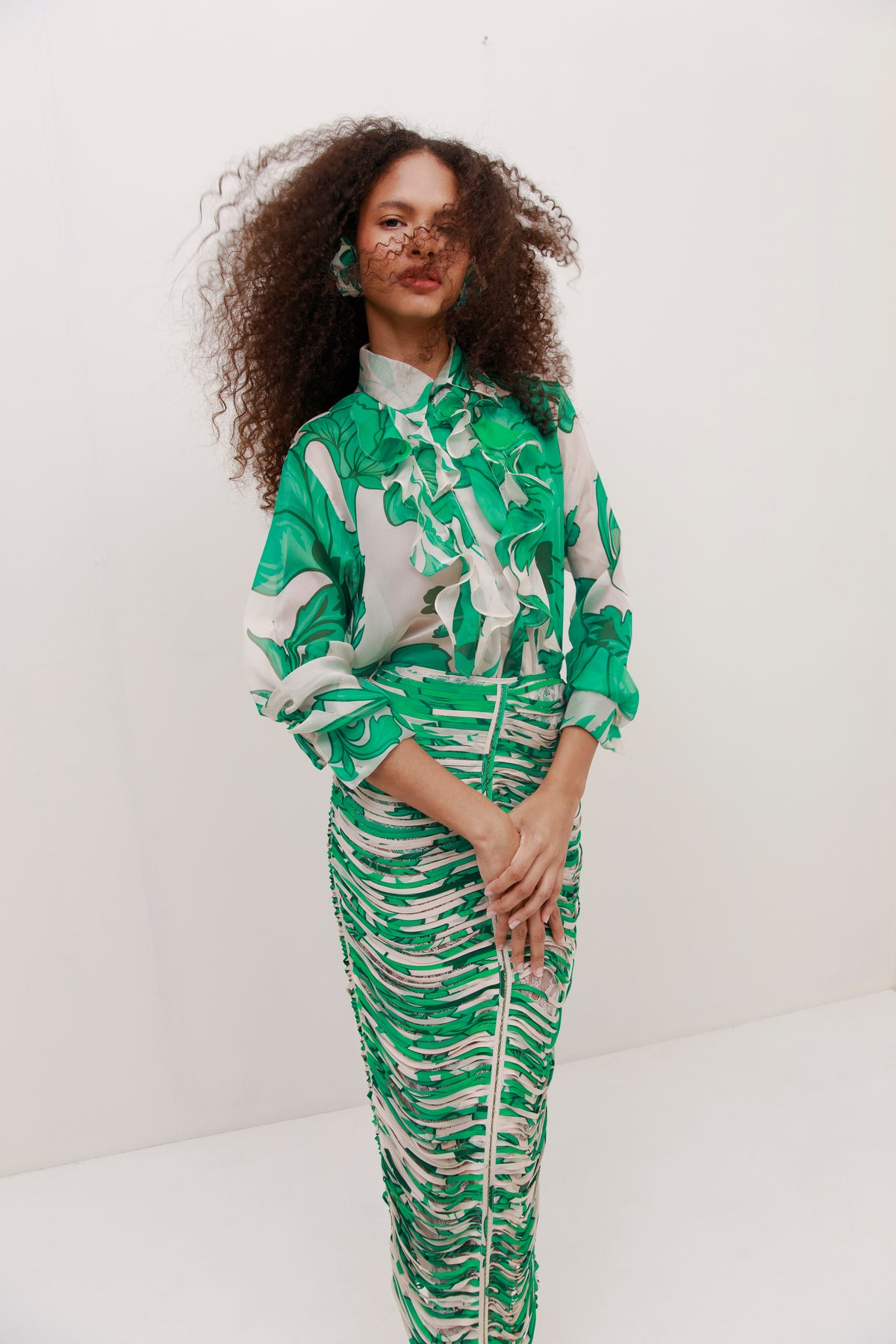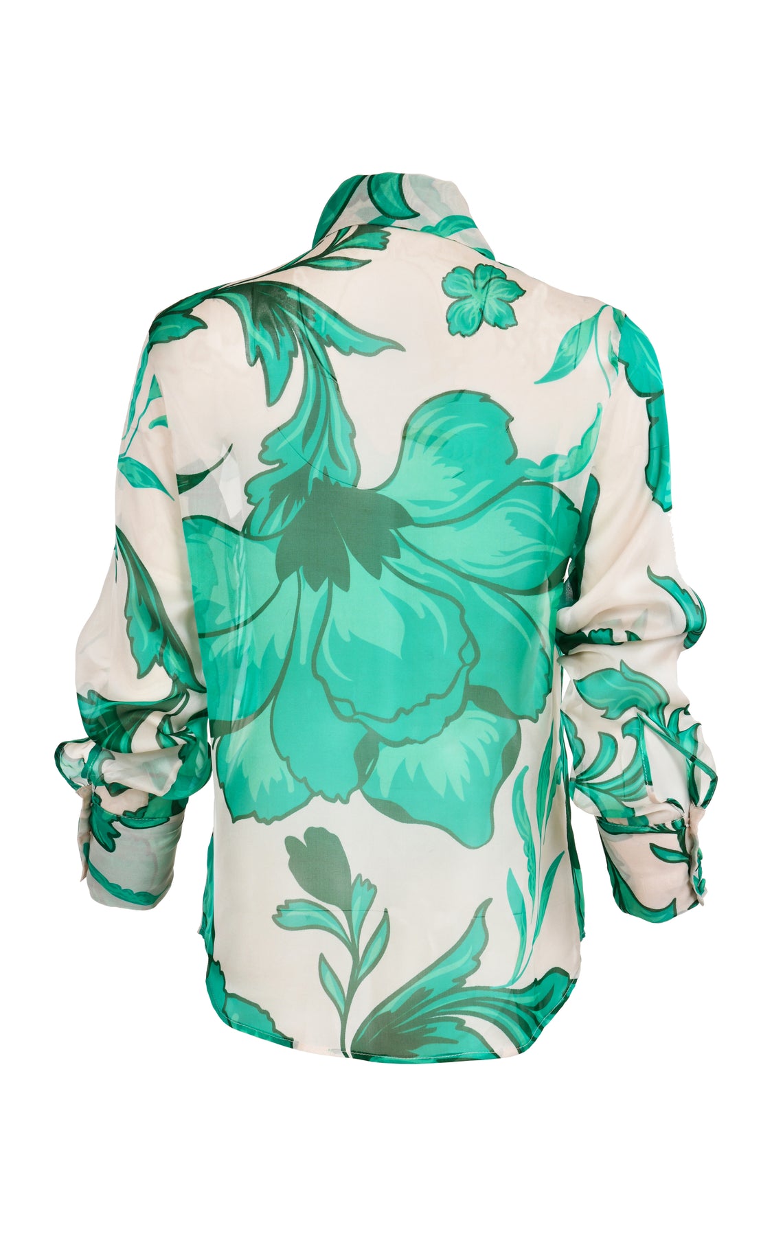 A bold take on feminine tailoring, the Oak Blouse features our leaf print in vivid green tones. Its lightweight silk and cascading ruffles add movement and dimension, making it a standout piece for both day and night.